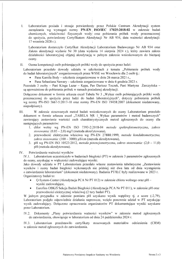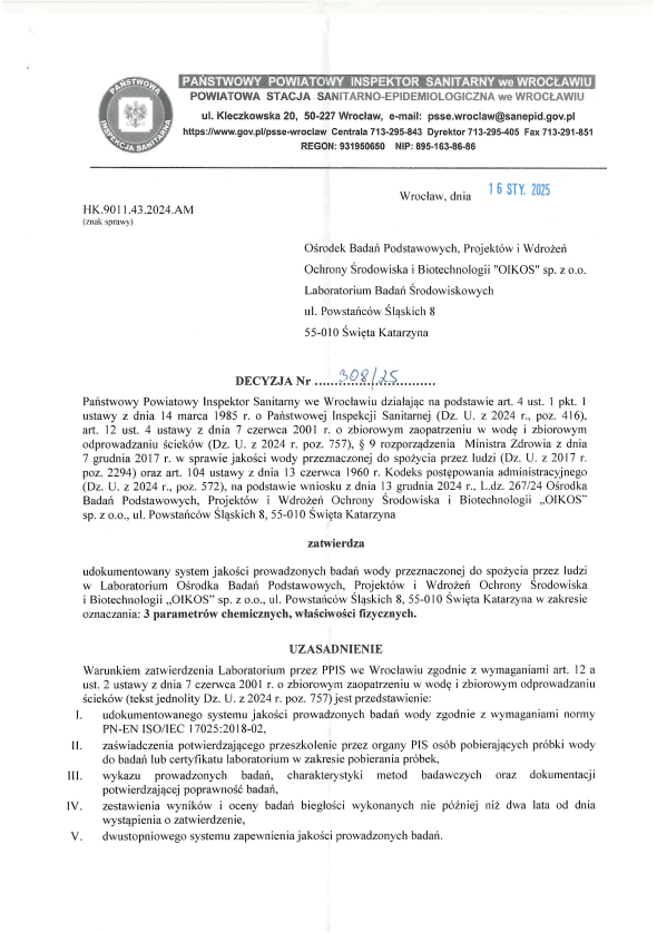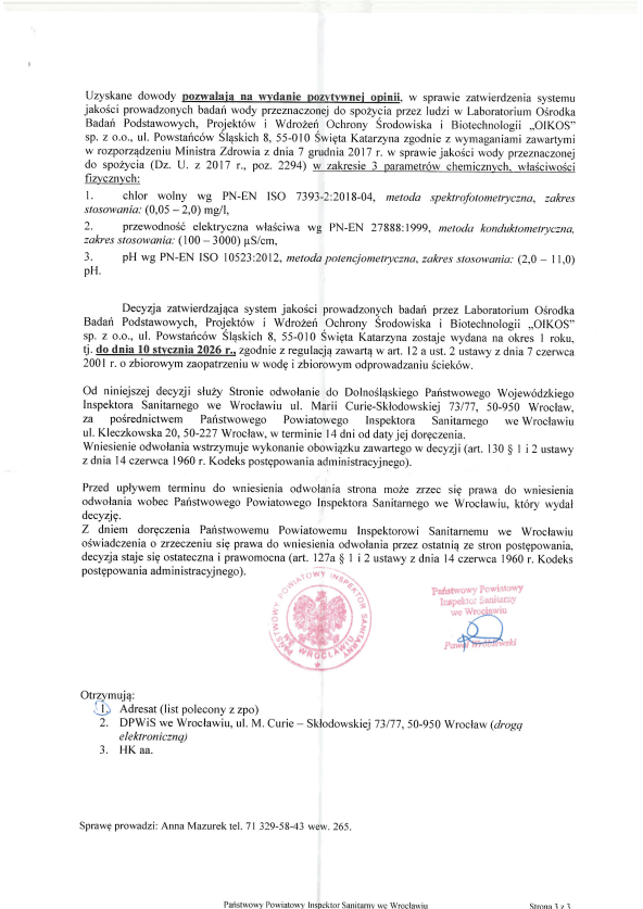 Laboratorium posiada Zatwierdzenie Państwowego Powiatowego Inspektora Sanitarnego do badania wody pitnej.