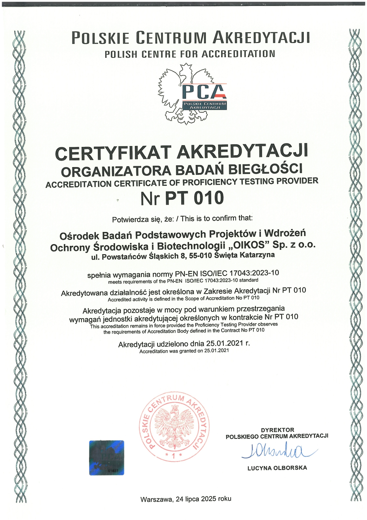 2025 07 24 Certyfikat Akredytacji PCA PT 010