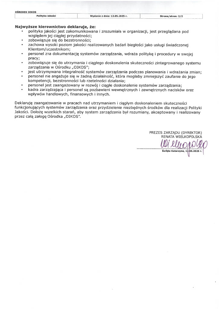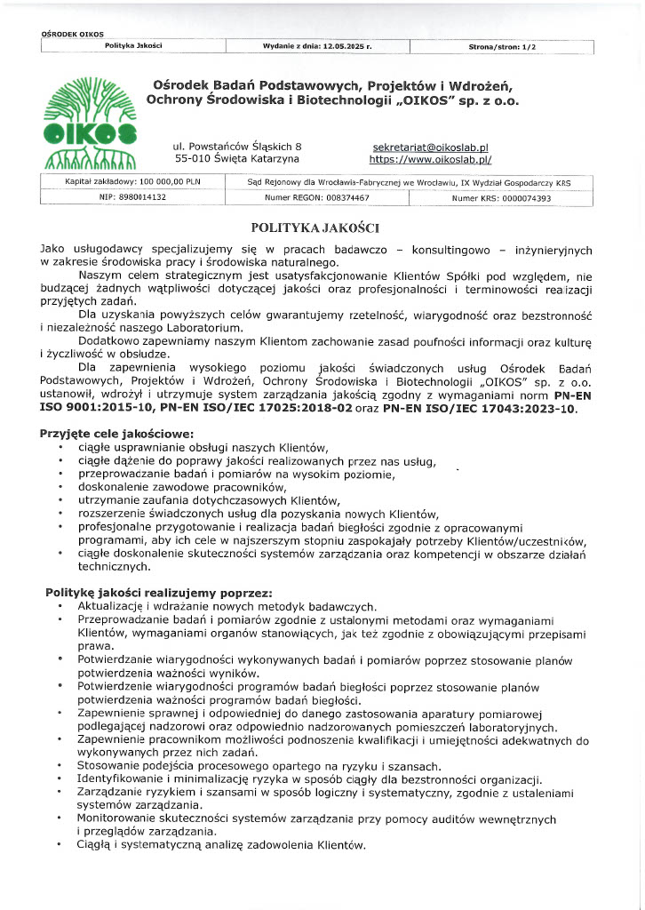 Polityka jakości Laboratorium OIKOS.